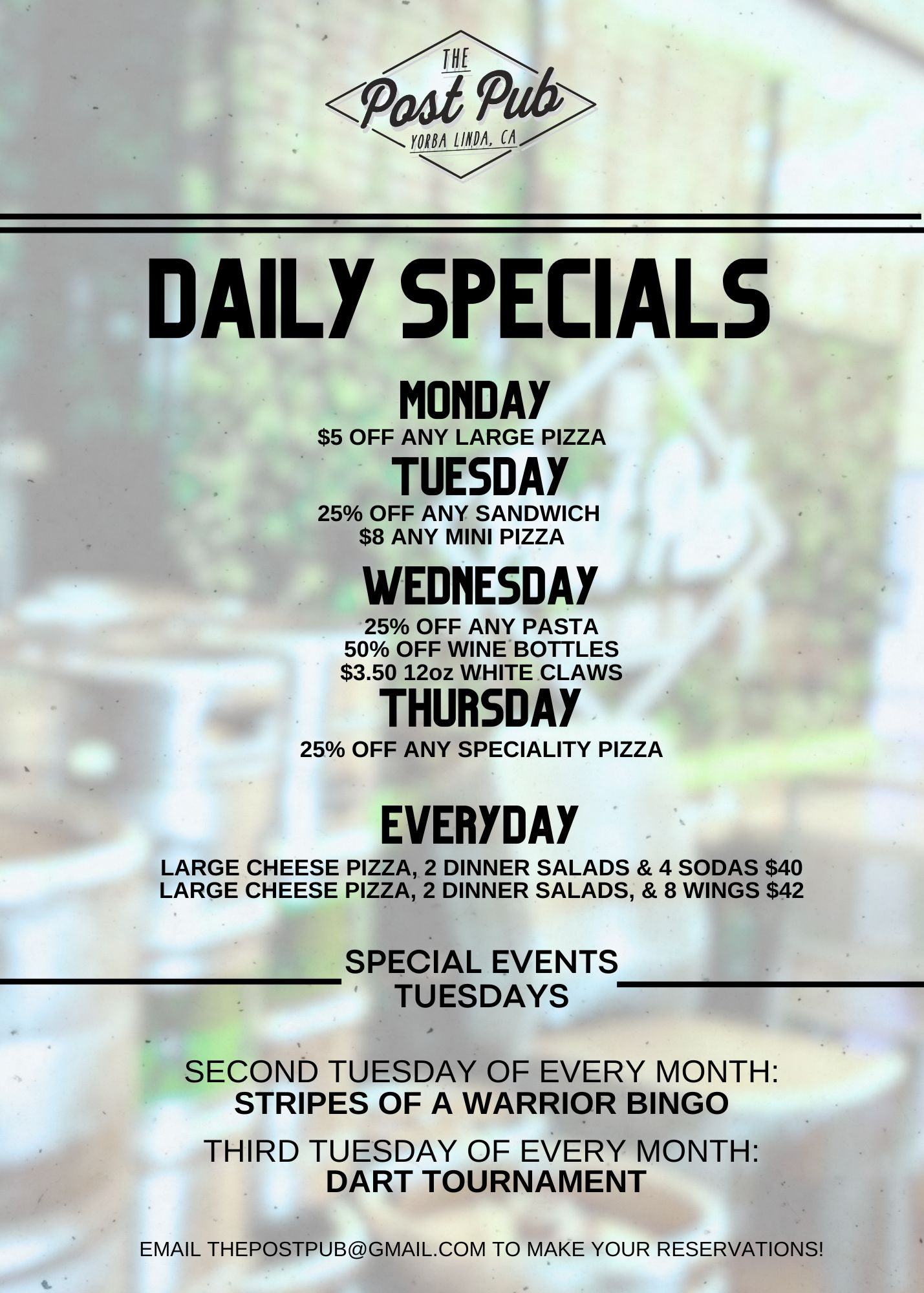 If you would like to sign up for the Stripes of a Warrior bingo night - please email thepostpub@gmail.com